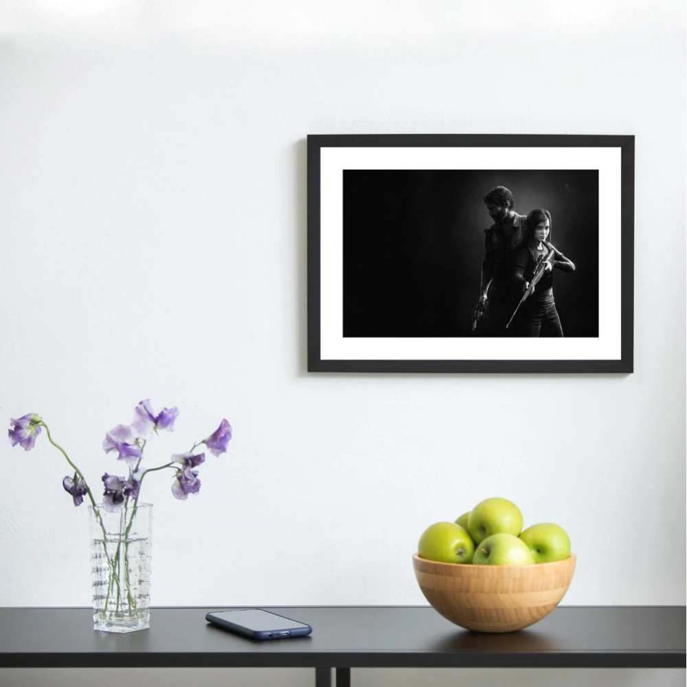 تصور کنید این پوستر جوئل و الی را روی دیوار اتاق بازیتان نصب کردهاید: کنتراست سیاه و سفید آن، فضا را مرموز و جذاب میکند، در حالی که قاب مشکی، ظاهری مینیمال و حرفهای به آن میبخشد.